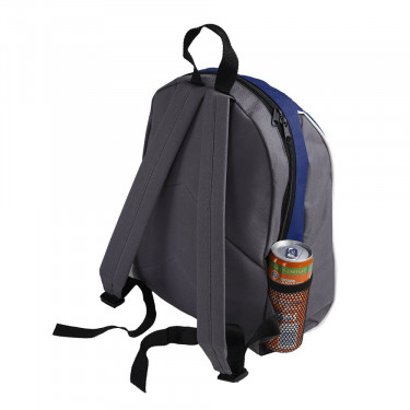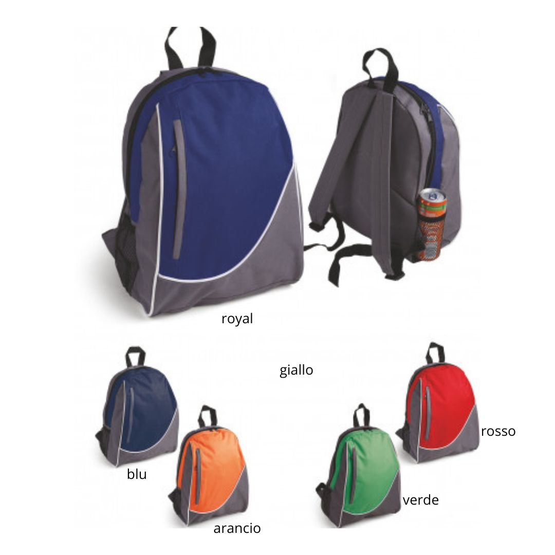 Zaino bicolore in poliestere 600D.Chiusura con zip. Tasca anteriore con zip. Tracolle regolabili e salvaspalle. Comodo manico. Taschino esterno in rete mesh.
