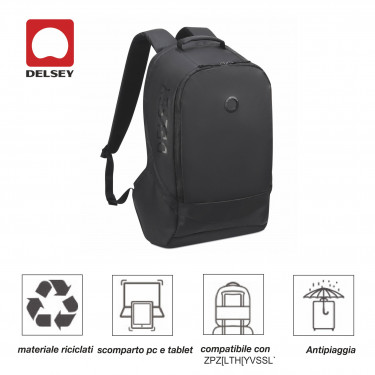 Zaino in PU RPET 600D con scomparto di protezione per PC e tablet, fodera riciclata, tasca con cerniera, rasca anti RFID, tasca frontale, manico superiore, idrorepel lente, dorso schiumato, 2 tasche laterali con cerniera, compatibile con il sistema TROLLEY.