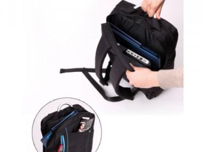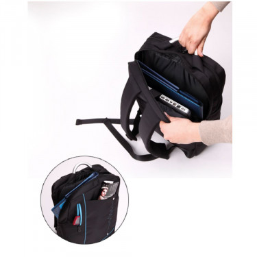 Zaino backpack in poliestere 300D. Doppio soffietto : porta computer 15” con velcro; tasca a rete chiusa con zip. Varie tasche anteriori chiuse da velcro e zip. Schienale e spallacci imbottiti e regolabili. Comodo manico allumino.