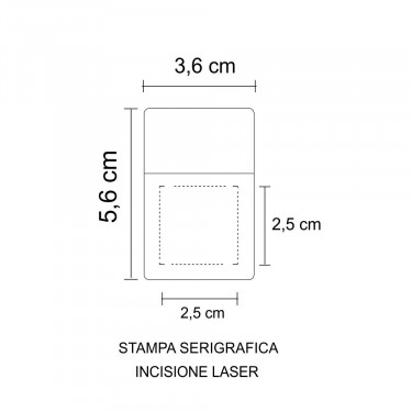Aria di stampa max cm 2.5 x 2.5 con stampa in serigrafia/tampografia monocolore (per stampa incisione o multicolor richiedere info). Grafica fornita dal cliente o richiedere bozza fornendo il logo in alta qualità o in vettoriale, inoltre indicare colore preferito e colore di stampa.