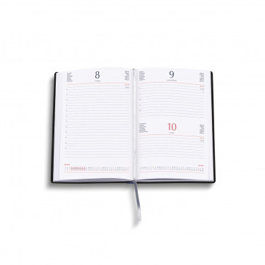 Agenda giornaliera “Tavecchi”.Materiale : printflex termovirante. Interno stampa 2 colori. Multilingue. Carta bianca usomano. Rubrica telefonica.