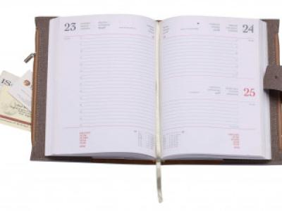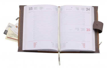 Agenda in materiale termovirante. Due tasconi c/zip. Chiusura cc/linguetta a pressione. Interno mobile giornaliero (15x21). Stampa 2 colori. Rubrica telefonica, carta bianca. Multilingue.