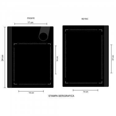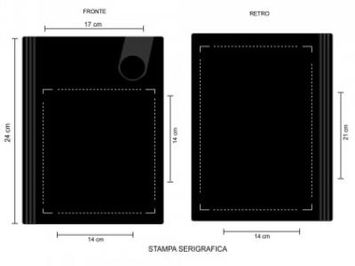 Aria di stampa max cm 14 x 14 oppure su lato più grande con stampa cm 14 x 21 con stampa in serigrafia monocolore. Grafica fornita dal cliente o richiedere bozza fornendo il logo in alta qualità o in vettoriale, inoltre indicare colore preferito articolo e colore di stampa.
