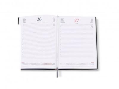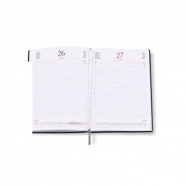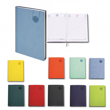 Agenda giornalera”Tavecchi”. Materiale: printflex termovirante. Interno stampa 2 colori. Multi-lingue Carta bianca. Cartina geografica, rubrica telefonica. Sabato e domenica separati.