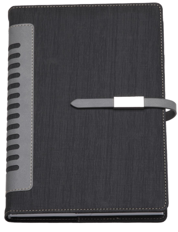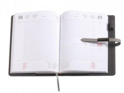 Agenda giornaliera Pu termovirante. Chiusa da linguetta con piastrina in metallo calamitato. Vano porta penna. Interno mobile giornaliero (15x21). Stampa 2 colori. Multilingue. Sabato e domenica abbinati. Carta bianca, rubrica telefonica, dati personali.