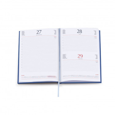 Agenda giornaliera in matra. Interno stampa 2 colori. Multilingue. Sabato e domenica abbinati, rubrica telefonica, cartina geografica. Dimensioni cm 17x24.