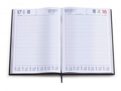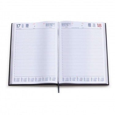 Agenda giornaliera in matra. Interno stampa 2 colori. Multilingue. Pagine 384. Sabato e dome-nica separati, rubrica telefonica, cartina geografica. Pagine perforate per facile strappo. Dimensioni cm 21x30.