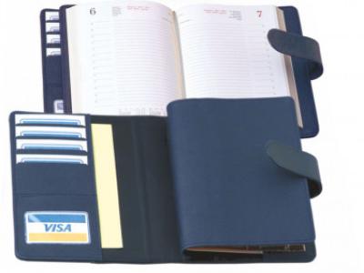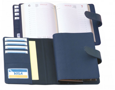 Agenda in similpelle. Vari scomparti porta carte credito, porta documenti. Vano porta penna. Interno mobile giornaliero (15x21). Stampa 2 colori. Multilingue. Sabato e domenica abbinati, rubrica telefonica, cartina geografica.