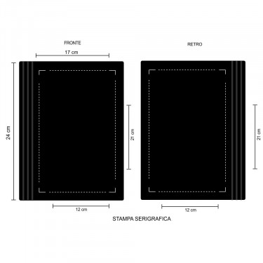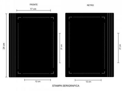 Aria di stampa max cm 12 x 21 oppure su lato più grande con stampa cm 12 x 21 con stampa in serigrafia monocolore. Grafica fornita dal cliente o richiedere bozza fornendo il logo in alta qualità o in vettoriale, inoltre indicare colore preferito articolo e colore di stampa.