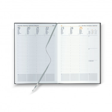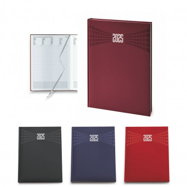 Agenda settimanale in matra. Interno stampa 2 colori. Multilingue. Rubrica telefonica, cartina geografica, calendario planning.
