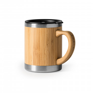 Tazza in acciaio inossidabile a doppia parete con esterno in bambù naturale. Include tappo dosatore.