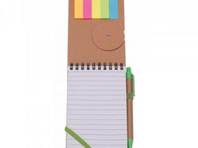 Blocco notes “ Eco Paper”. Chiuso con elastico colorato. Corredato di: 25 post-it per colore, penna refill nero.