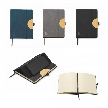 Block notes con copertina rigida in RPET, funzione di supporto cellulare, chiusura con elastico, inserto per penna, 80 fogli.