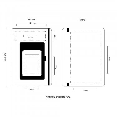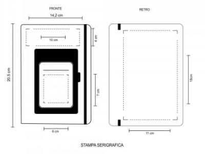 Blocco notes con elastico. PU Termovirante. Varie tasche esterne, p/penna, p/cellulare, p/card. Carta bianca 80 gr.100 fogli/200 pagine. Colori: verde, rosso, nero, blu, bianco e arancio. Confezione in polybag. Dimensioni: cm.14,2x20,5. Aria di stampa per questo articolo e in serigrafia con stampa in entrambi i lati su richiesta, stampa fronte e di cm 10x4 ed cm 6x7 , stampa retro e di cm 11x18, la stampa e in monocolore ( se si desidera la stampa a più colori farne richiesta per eventuale possibilità e per il prezzo). Grafica fornita dal cliente o richiedere bozza fornendo il logo in alta qualità o in vettoriale, inoltre indicare colore preferito e colore di stampa. Il prezzo indicato e per un pezzo compreso stampa solo frontale in serigrafia, con un minimo di ordine 30 pezzi, per ordine multipli viene applicato uno sconto