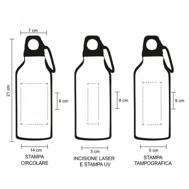 Borraccia in alluminio. Resistente all’acqua. Completa di moschettone. Capacità 400ml.