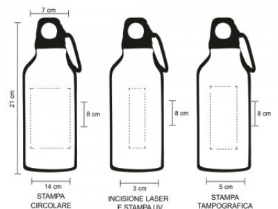 Borraccia in alluminio. Resistente all’acqua. Completa di moschettone. Capacità 500ml.