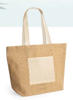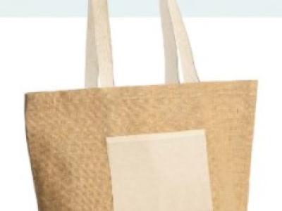 Borsa in juta laminata con tasca frontale e manici lunghi in cotone naturale, aria di stampa riquadro centro borsa con stampa in serigrafia monocolore. Se si desidera la stampa su ambo i lati richiedere se e possibile su questo articolo e costi aggiuntivi.