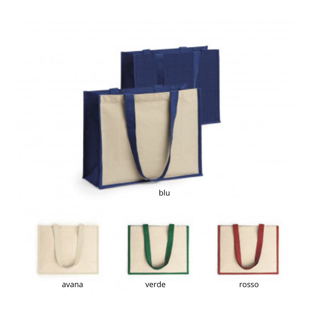 Borsa in juta laminata con un lato in cotone ideale per la marcatura e manici lunghi, aria di stampa max cm 27 x 25 con stampa in serigrafia monocolore. Se si desidera la stampa su ambo i lati richiedere se e possibile su questo articolo e costi aggiuntivi.