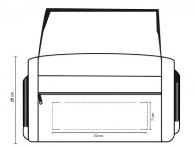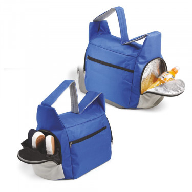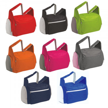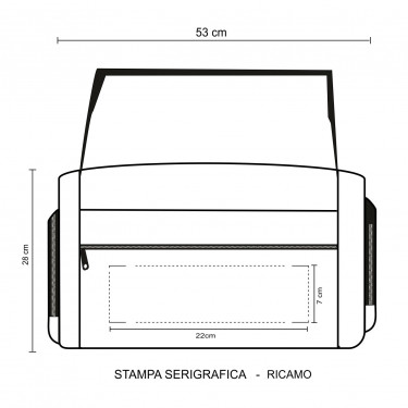 Borsa palestra in poliestere 600D. Tascone anteriore con zip. Doppie tasche laterali chiuse da zip: uso termico, uso porta scarpe. Manico a tracolla salva spalle. Interno plastificato. Aria di stampa max cm 22 x 7 con stampa in serigrafia monocolore. Grafica fornita dal cliente o richiedere bozza fornendo il logo in alta qualità o in vettoriale, inoltre indicare colore preferito e colore di stampa.