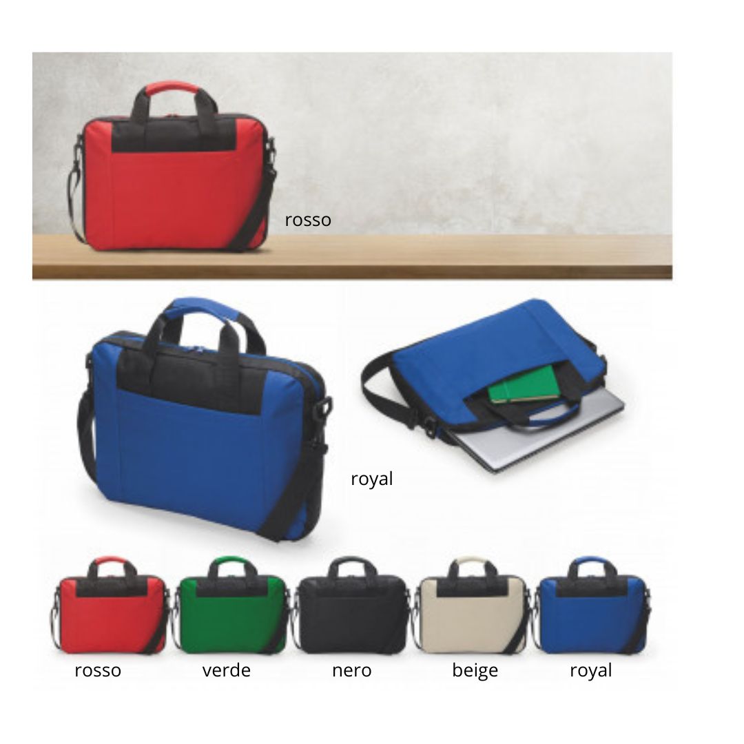 Borsa Portacomputer 15,6”. Tracolla regolabile con moschettone, tasca esterna con zip.