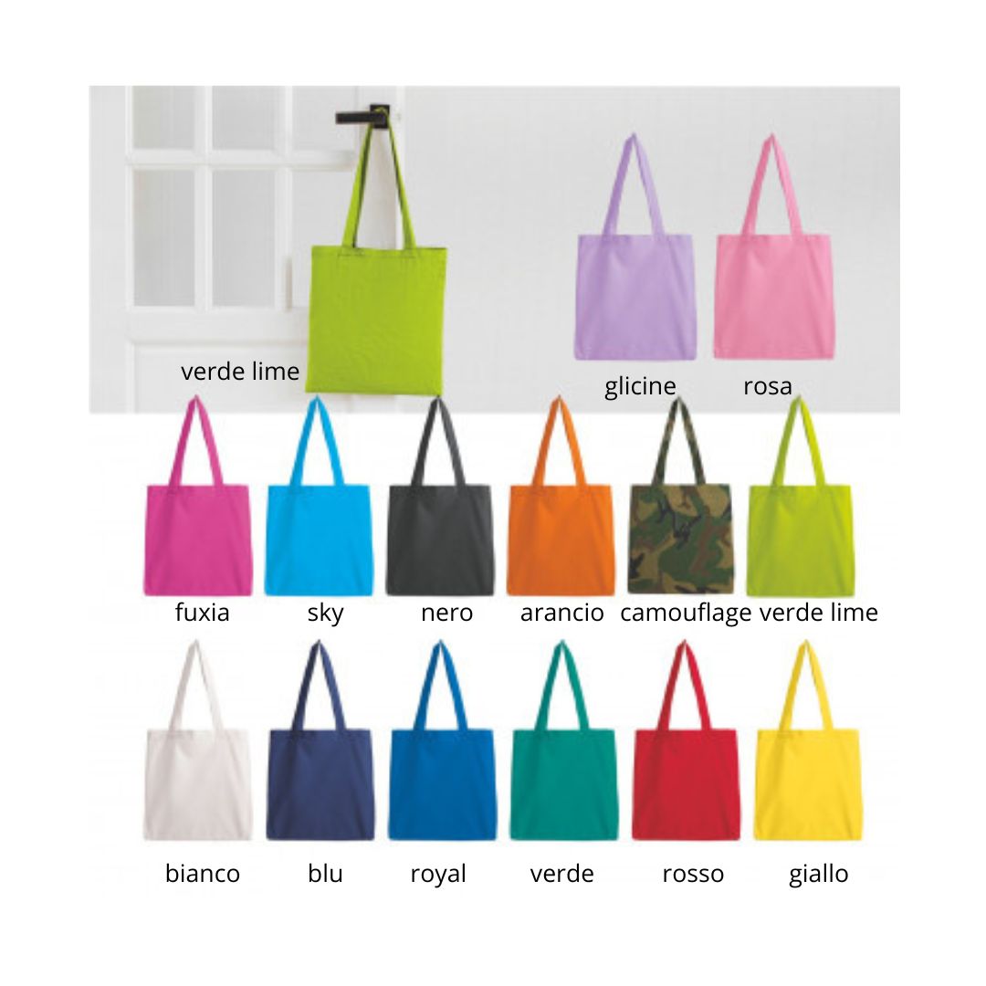 Borsa in cotone. 130 gr. Manici a tracolla (cm 2,5x60), aria di stampa max cm 27 x 21 con stampa in serigrafia monocolore. Se si desidera la stampa su ambo i lati richiedere se e possibile su questo articolo e costi aggiuntivi.