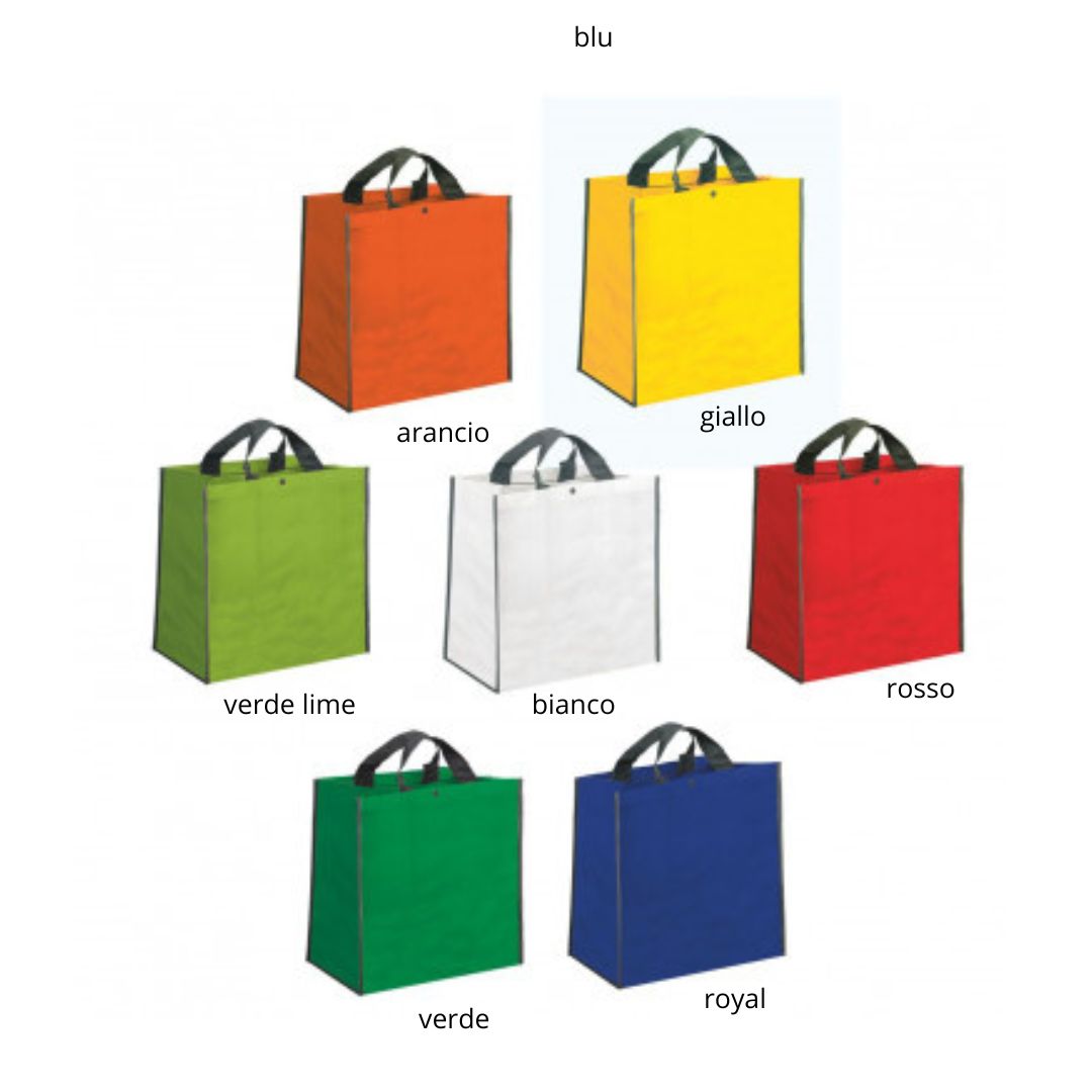 Borsa shopping PP. Doppio manico. Chiusura con bottoncino, aria di stampa max cm 28.5 x 21 con stampa in serigrafia monocolore. Se si desidera la stampa su ambo i lati richiedere se e possibile su questo articolo e costi aggiuntivi.
