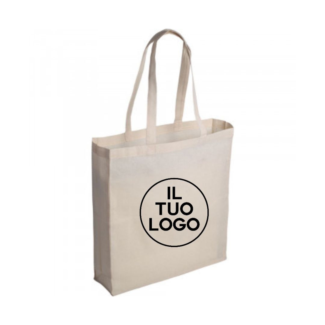 Borsa shopping con soffietto (cm.10) cotone 120 gr. Manici tracolla (cm. 2,5x60), aria di stampa max cm 27 x 21 con stampa in serigrafia monocolore. Se si desidera la stampa su ambo i lati richiedere se e possibile su questo articolo e costi aggiuntivi.