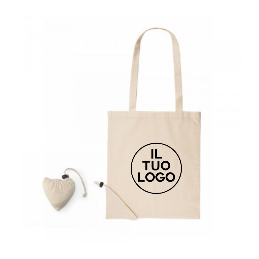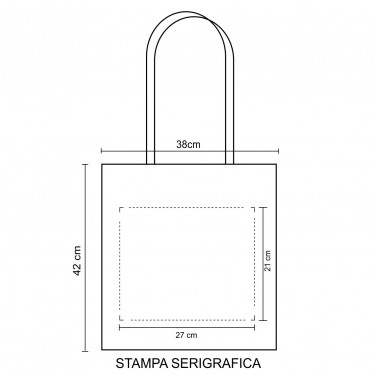 Borsa shopping cotone 130gr. Cuciture interne. Manici lunghi cm.2,5x68. Richiudibile su se stessa a forma di cuore. Chiusura con coulisse, aria di stampa max cm 27 x 21 con stampa in serigrafia monocolore. Se si desidera la stampa su ambo i lati richiedere se e possibile su questo articolo e costi aggiuntivi.