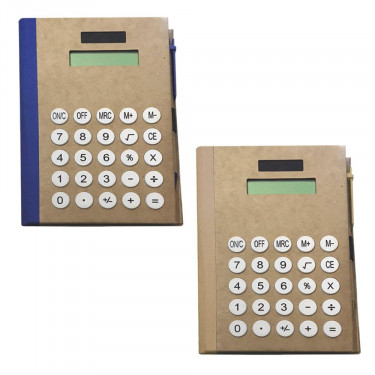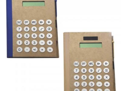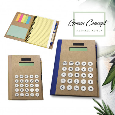 Calcolatrice “Eco paper”. Corredata di : blocco notes a righe 75 fogli/150 pagine, 25 post-it per colore, penna refill nero.
