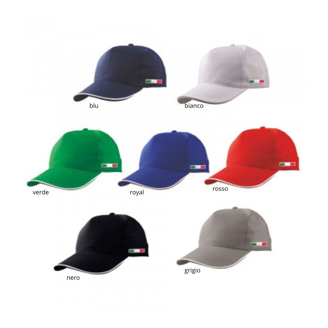 Cappello golf 5 pannelli cotone 100%. Bandiera ricamata su lato. Regolatore velcro. Colori: blu, bianco, rosso, royal, verde, grigio, nero. . Aria di stampa max CM 10 X 5 cm in serigrafia monocolore (per stampa multicolor richiedere info). Grafica fornita dal cliente o richiedere bozza fornendo il logo in alta qualità o in vettoriale, inoltre indicare colore preferito e colore di stampa. Il prezzo indicato e per un pezzo compreso stampa in serigrafia, con un minimo di ordine 50 pezzi, per ordine multipli viene applicato uno sconto.