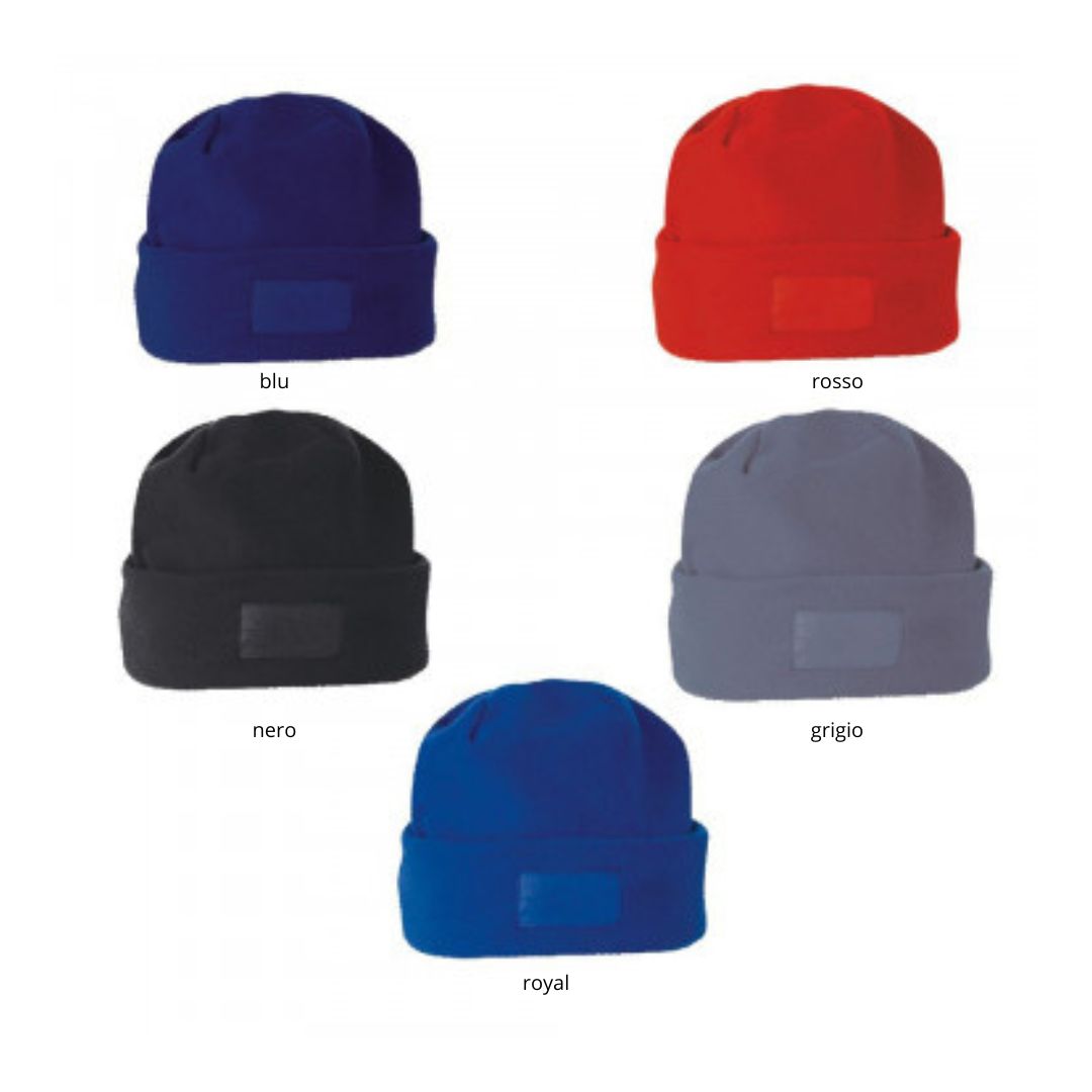 Cappello in pile con risvolto. Etichetta serigrafabile.