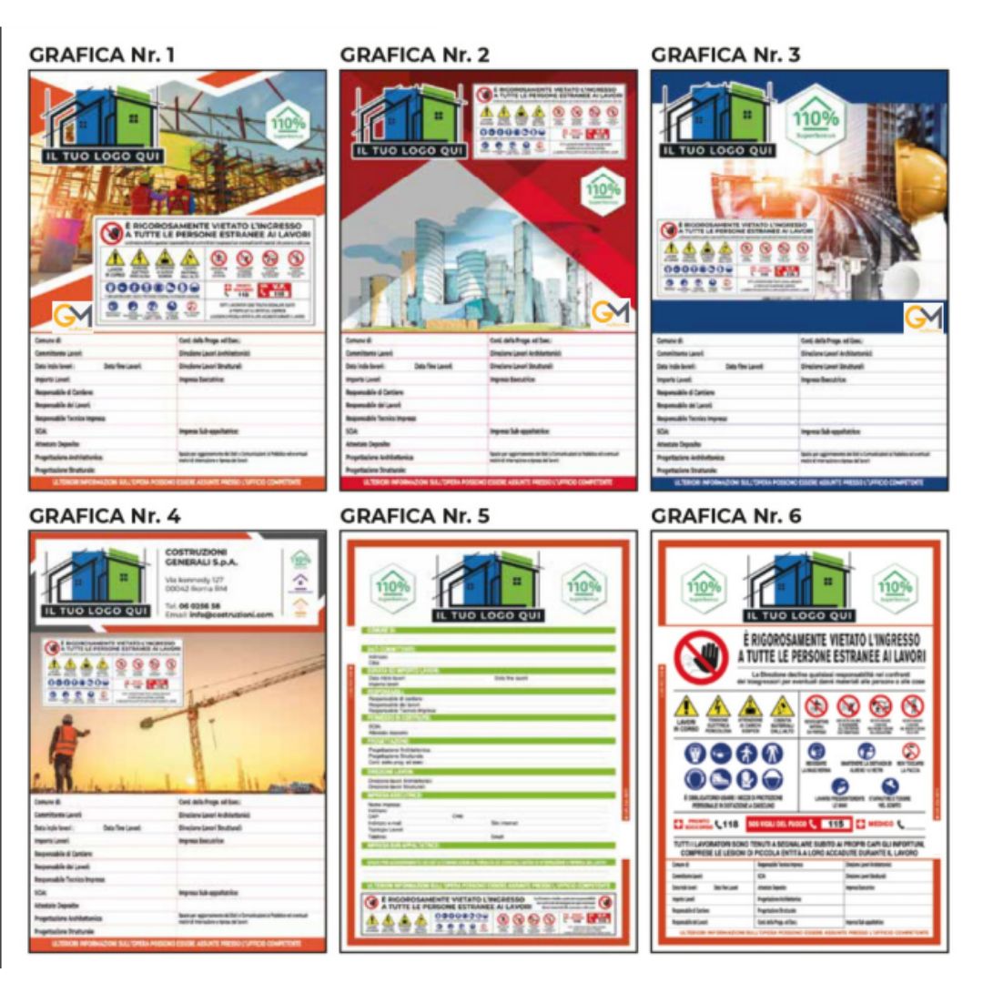 cartello cantiere realizzato in polionda antistrappo misure cm 100 x 70 cm oppure 70 cm x 100 cm personalizzato con il vostro logo dove in foto riportato GM in grande e grafica da scegliere tra quelle presenti in foto, dove riportano anche immagini di numeri utili in caso di emergenza e sicurezza. I polionda sono con angoli arrotondati e quattro fori agli angoli. Grafica fornita dal cliente o da concordare per la realizzazione, prezzo riportato e per pezzo singolo ma con minimo ordine di 18 pezzi o multipli di 18. possibilità di spedizione da concordare.