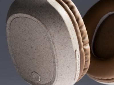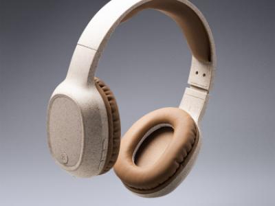 Cuffie wireless in fibra di grano. Imbottitura e cuffie in similpelle, pannello di controllo integrato con tecnologia stereo, funzione vivavoce e radio FM, batteria ricaricabile, cavo incluso.