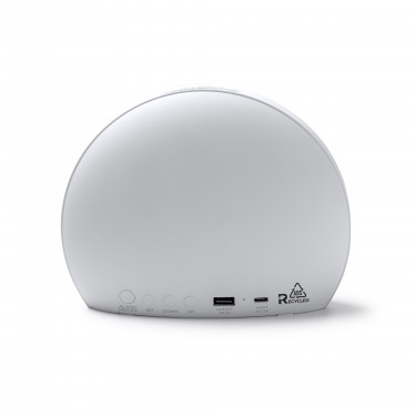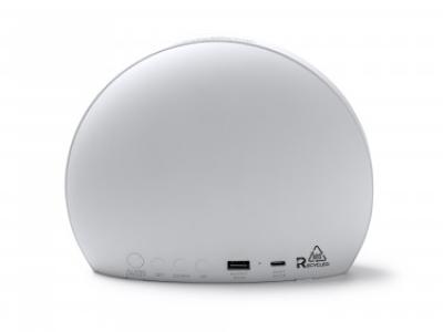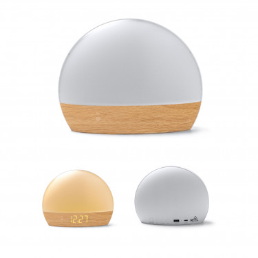 Lampada sveglia in ABS riciclato con modalità di illumi nazione progressiva, funzionalità: ora, data e temperatura, luce a LED in diversi colori, cavo incluso. Confezione in scatola eco design. Dimensioni: cm 18,5x14,4x6,6. Aria di stampa parte bassa della lampada con stampa in serigrafia monocolore. Grafica fornita dal cliente o richiedere bozza fornendo il logo in alta qualità o in vettoriale, inoltre indicare colore preferito e colore di stampa. il prezzo indicato e per un pezzo compreso stampa con un minimo di ordine di 1 cartone contenente 30 pezzi per colore, per ordine multipli viene applicato uno sconto.