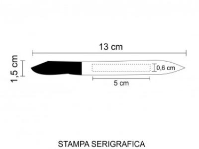 Aria di stampa max cm 5 x 0.6 con stampa in serigrafia/tampografia monocolore. Grafica fornita dal cliente o richiedere bozza fornendo il logo in alta qualità o in vettoriale, inoltre indicare colore preferito e colore di stampa.