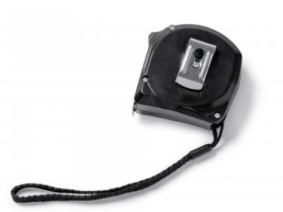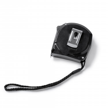 Flessometro da 5 m con meccanismo di bloccaggio e gancio a nastro metallico. Clip in metallo, tracolla e dettagli in bamboo.