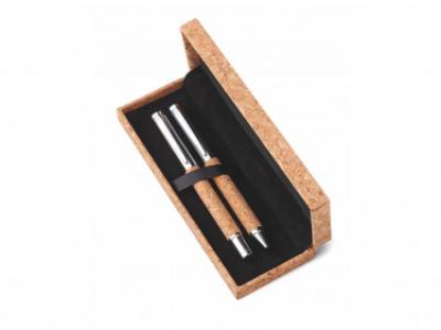 Parure composto da penna a sfera refil nero e penna gel in sughero e metallo. Confezione in astuccio di sughero.