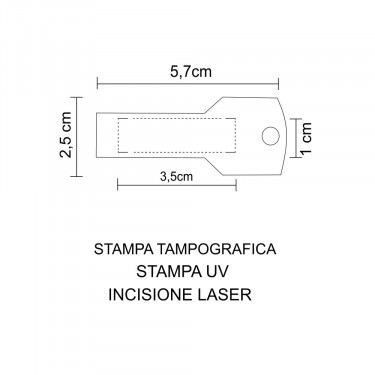 Aria di stampa cm 3.5 x 1 con stampa in serigrafia/tampografia monocolore. Grafica fornita dal cliente o richiedere bozza fornendo il logo in alta qualità o in vettoriale, inoltre indicare colore preferito e colore di stampa. Per incisioni LASER ED UV richiedere preventivo.