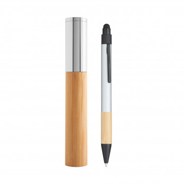 Penna con touch in bamboo e metallo. Clip in plastica. Refill nero. Confezione in astuccio di bamboo. Dimensioni: astuccio 16,4 x 2,2 cm, penna 13,6 cm. Aria di stampa max cm 5 x 0.7 con stampa in tampografia, CM 4 X 1.2 cm in serigrafia monocolore per entrambe le modalità (per stampa incisione o multicolor richiedere info). Grafica fornita dal cliente o richiedere bozza fornendo il logo in alta qualità o in vettoriale, inoltre indicare colore preferito e colore di stampa. Possibilità di stampa LASER richiedendo sempre preventivo. Il prezzo indicato e per un pezzo compreso stampa in serigrafia, con un minimo di ordine 25 pezzi, per ordine multipli viene applicato uno sconto.