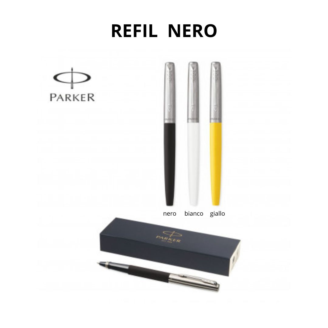 Penna Parker Roller in plastica e metallo. Refill nero. In confezione regalo. si possono acquistare anche neutre. Aria di stampa max cm 5 x 0.7 con stampa in tampografia, CM 4 X 1.2 cm in serigrafia monocolore per entrambe le modalità (per stampa incisione o multicolor richiedere info). Grafica fornita dal cliente o richiedere bozza fornendo il logo in alta qualità o in vettoriale, inoltre indicare colore preferito e colore di stampa. Colori: vedi foto colori disponibili Il prezzo indicato e per un pezzo compreso stampa in serigrafia, con un minimo di ordine 10 pezzi, per ordine multipli viene applicato uno sconto.