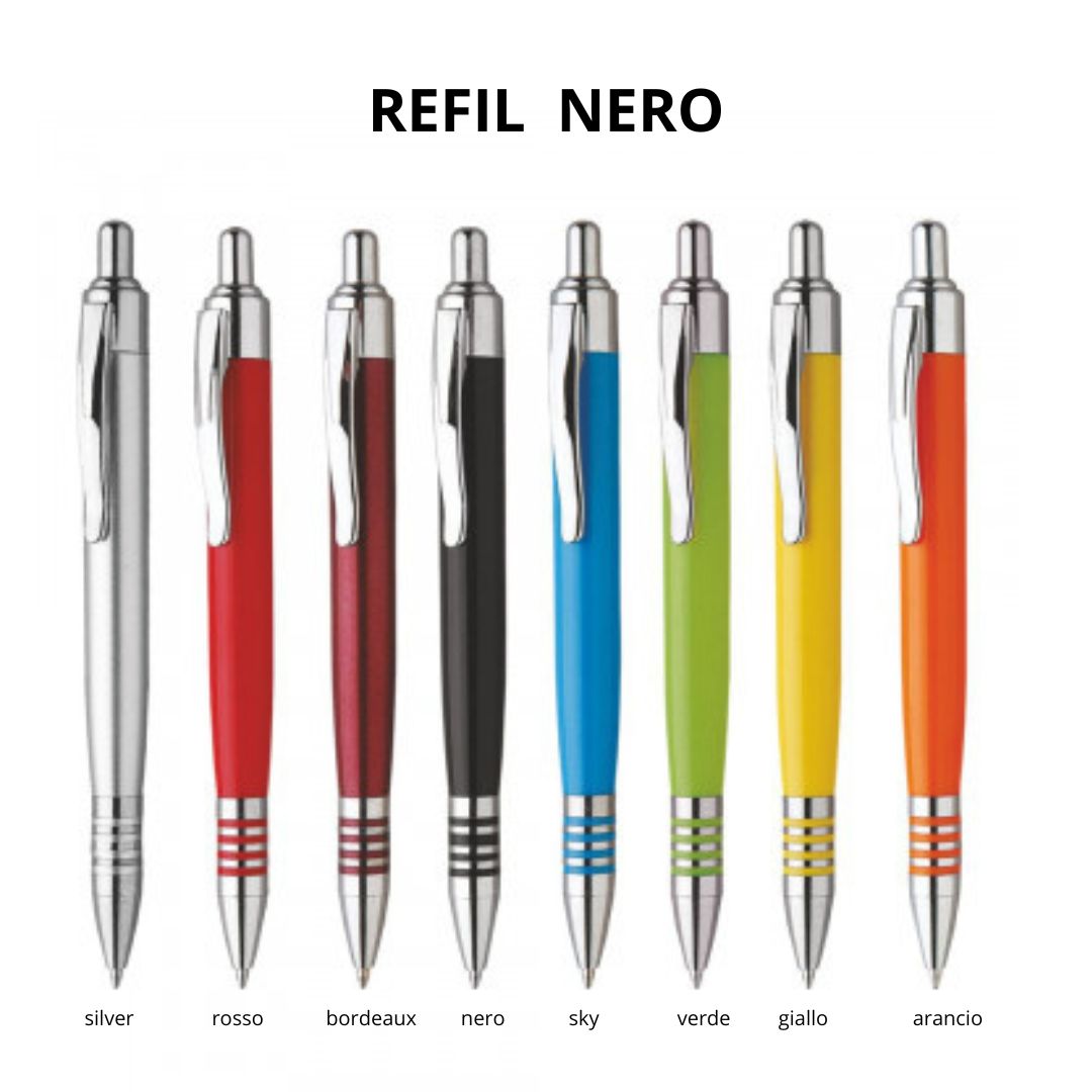 Penna sfera a scatto in plastica con clip in metallo. Fusto colorato particolari silver. Refill nero.
