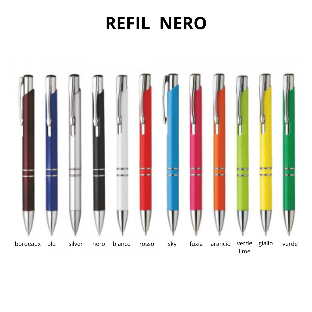 Penna sfera a scatto in plastica con clip metallo. Fusto colorato particolari silver. Refill nero.