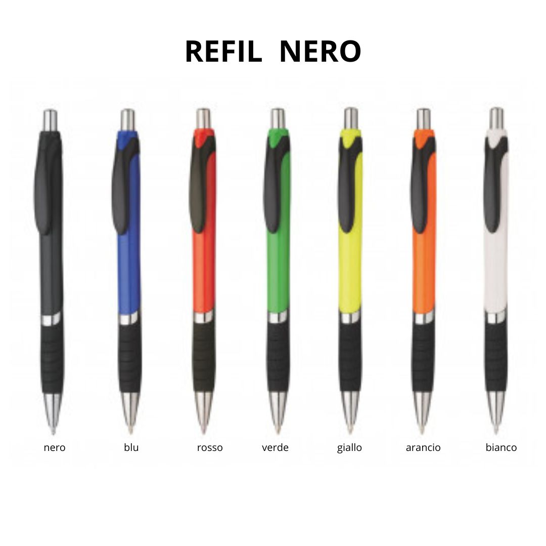 Penna sfera a scatto in plastica con clip in plastica. Fusto colorato particolari neri. Refill nero.