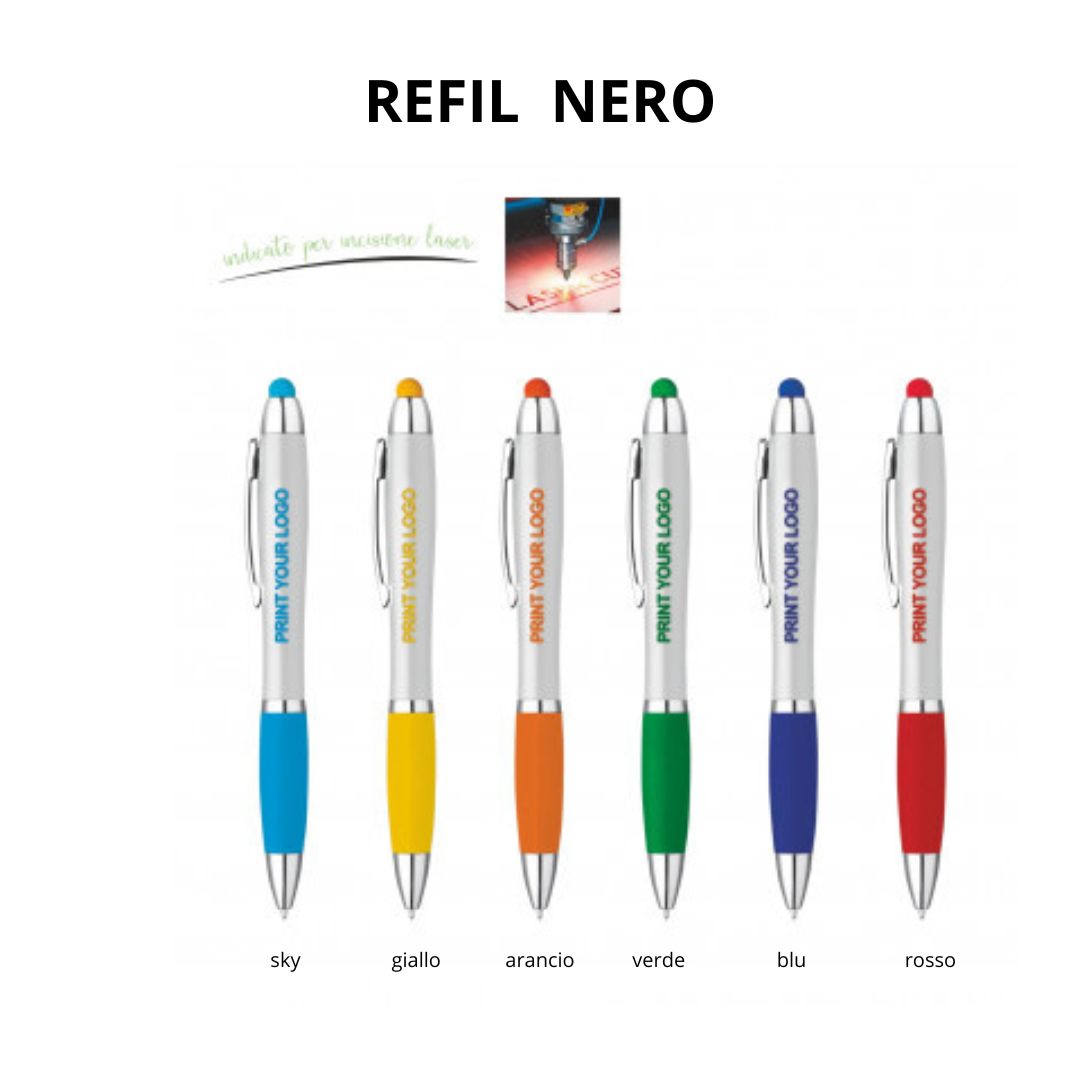 Penna Sfera Touch con led con incisione laser sul fusto, il logo si llumina con luce di colore come gommino. In palstica con clip in metallo. Refill nero.