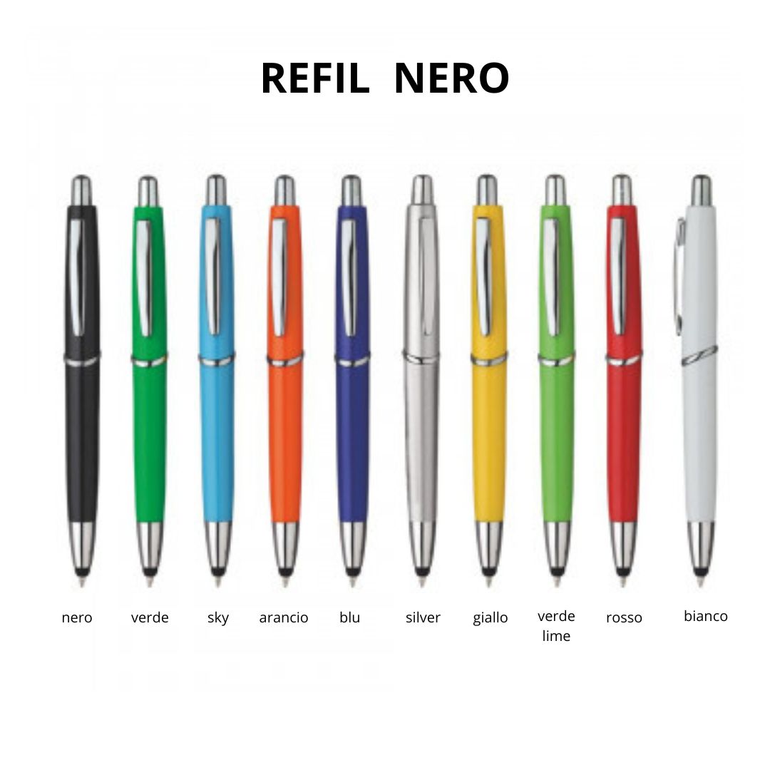 Penna sfera touch a scatto in plastica clip metallo. Fusto colorato. Refill nero.