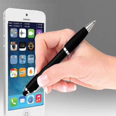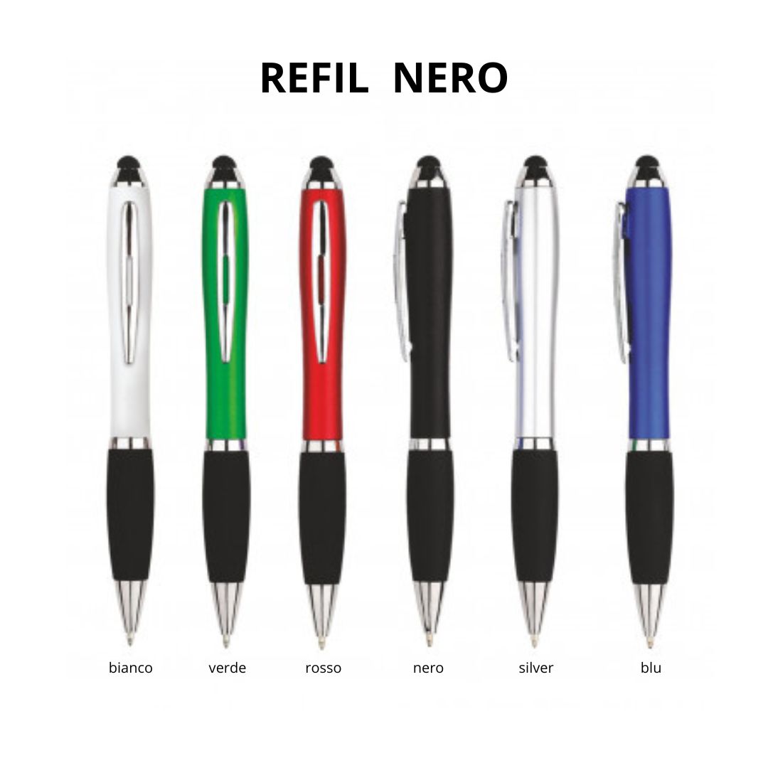 Touch pen a scatto rotante in plastica con clip in metallo. Refill nero.