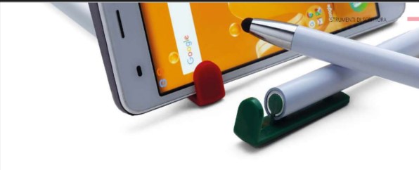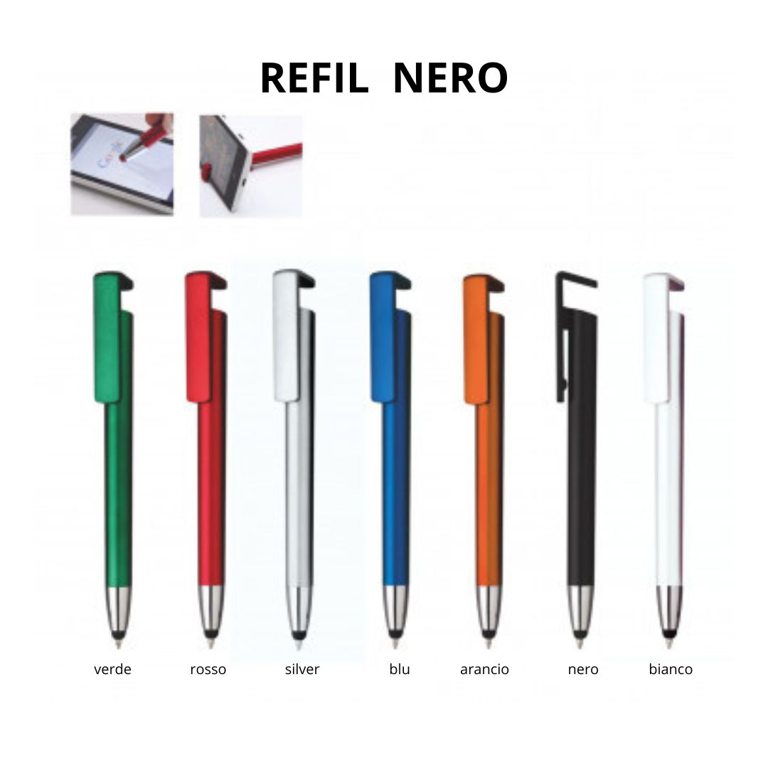 Penna sfera a scatto touch in plastica. Clip funzionalità supporto cellulare. Fusto colorato. Refill nero.