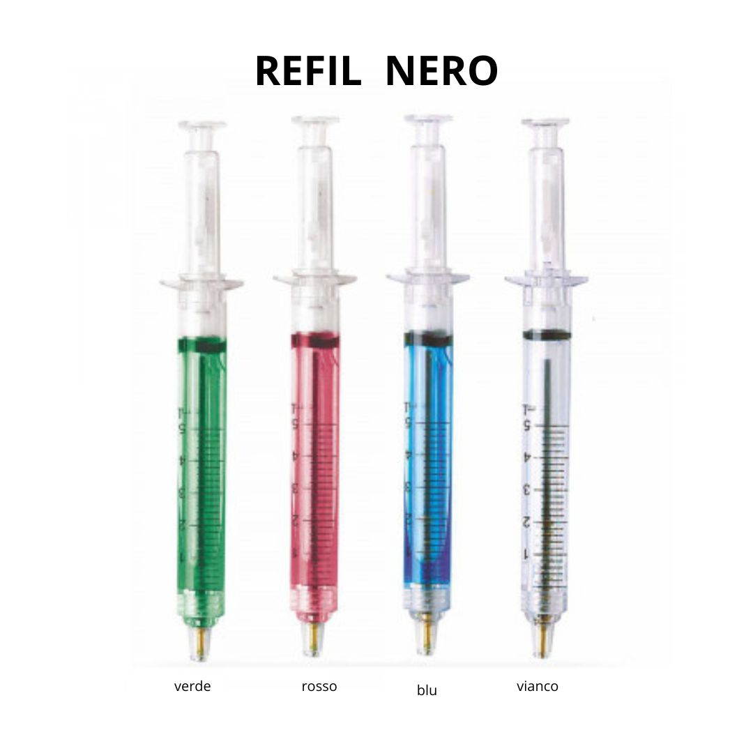 Penna sfera a scatto in plastica. Fusto trasparente inchiostro colorato. Refill nero.