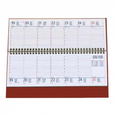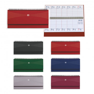 Planning spiralato in matra. 128 pagine. Carta usomano bianca 70 gr. Interno stampa 2 colori, datato. Dimensioni cm 30x15. Colori: blu, verde, bordeaux, nero, rosso, grigio. Aria di stampa max cm 28 x 2 con stampa in serigrafia monocolore. Grafica fornita dal cliente o richiedere bozza fornendo il logo in alta qualità o in vettoriale, inoltre indicare colore preferito articolo e colore di stampa. il prezzo indicato e per un pezzo compreso stampa con un minimo di ordine di 1 cartone contenente 20 pezzi per colore, per ordine multipli viene applicato uno sconto.