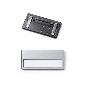 Portabadge con parte anteriore in alluminio. Spilla di sicurezza a doppia chiusura.